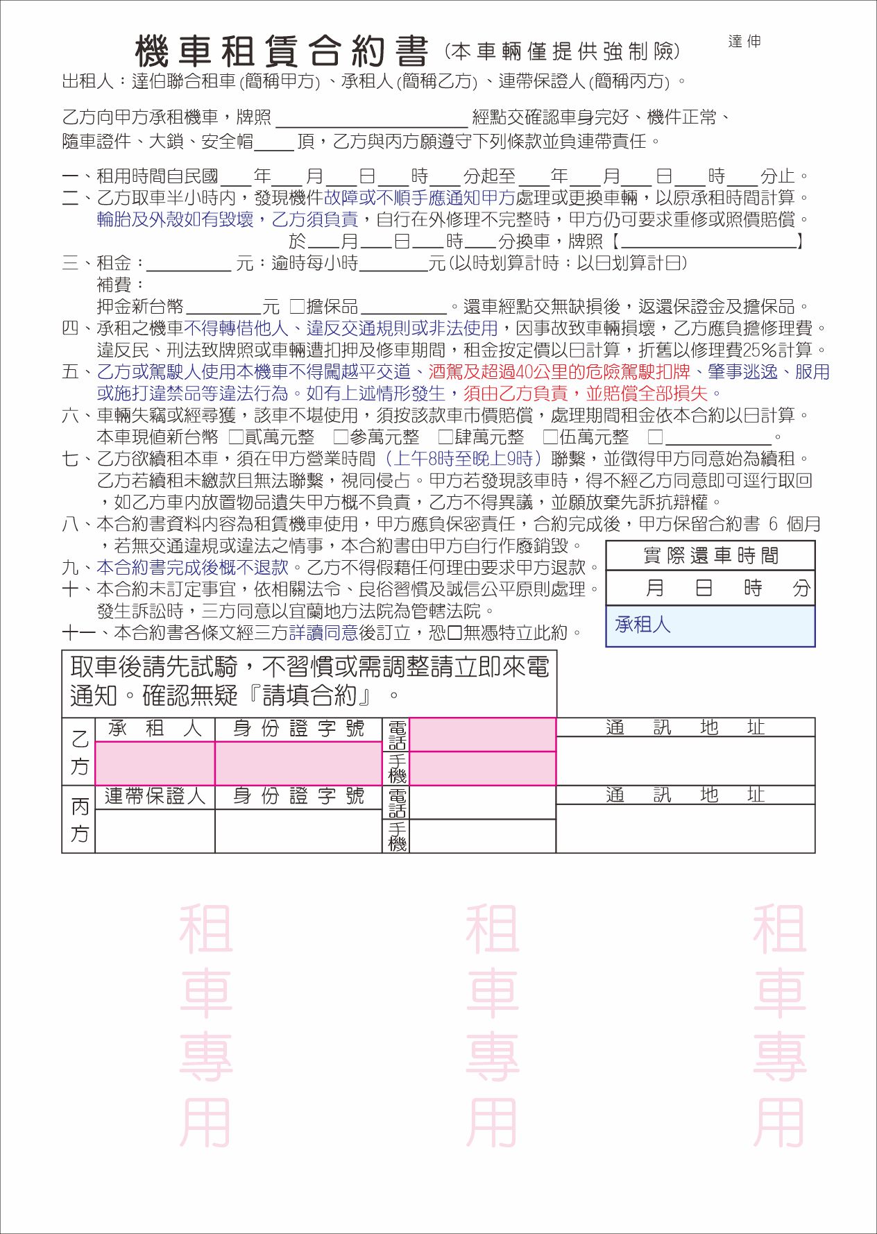 九. 其餘未盡事宜,以汽車出租單(汽車租賃契約書、機車租賃合約書)為準。
