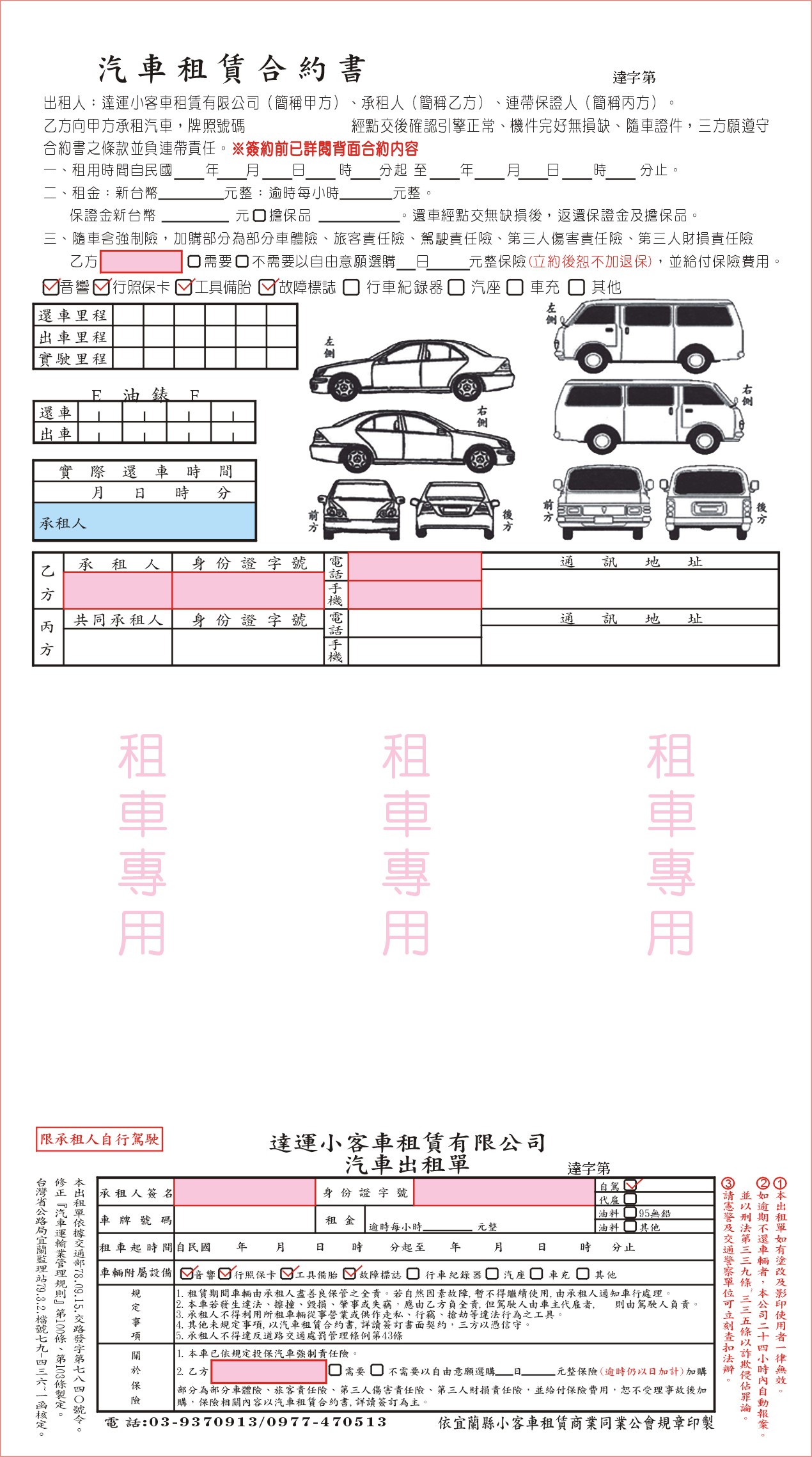 (A) 須簽定租車合約、請攜帶駕照辦理(汽車請攜帶駕照及身分證)