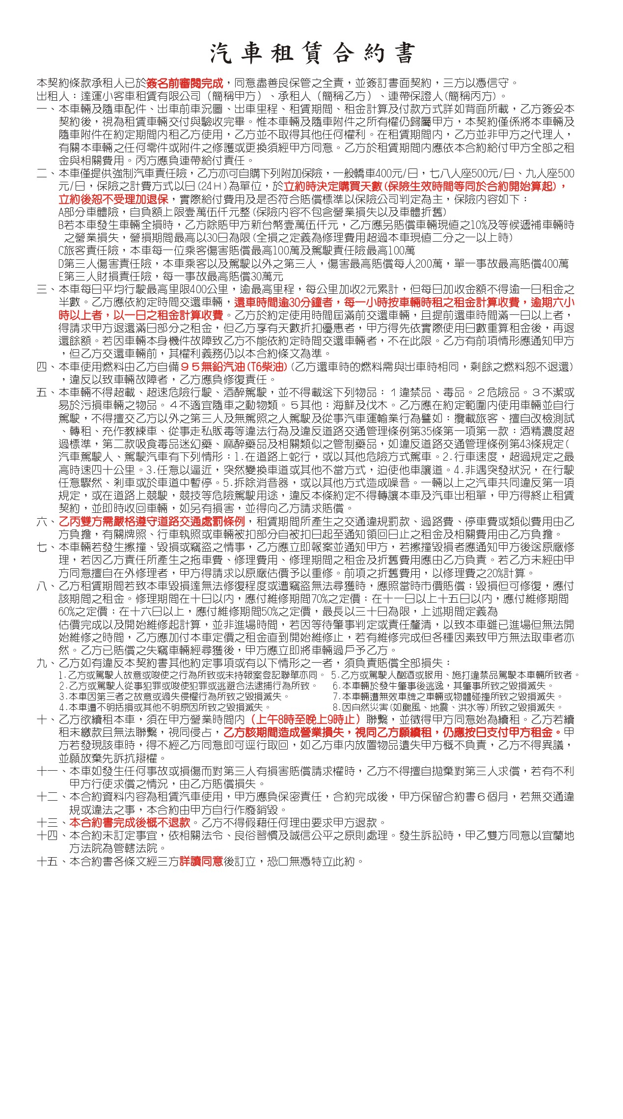四. 為保護您的權益,承租車輛發生碰撞或失竊時,請保持現場,並立即報警處理,切勿與對方私下和解,並和本公司聯絡,否則承租人須負賠償責任,並無法享租賃契約書保險理賠保障。